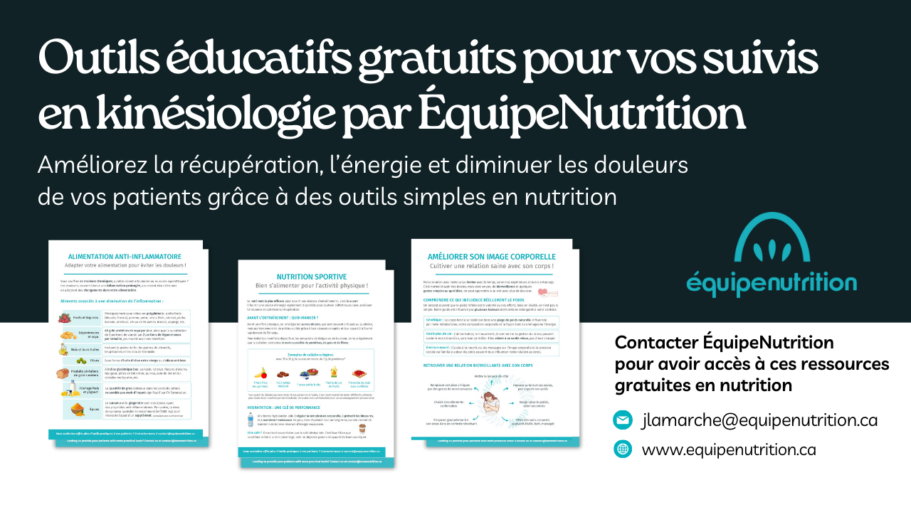 Obtenez nos outils gratuits pour enrichir vos interventions. Ces ressources vous permettent d’aborder la nutrition avec vos clients et de démontrer comment de saines habitudes alimentaires soutiennent leurs objectifs sportifs, tout en complétant vos recommandations professionnelles.